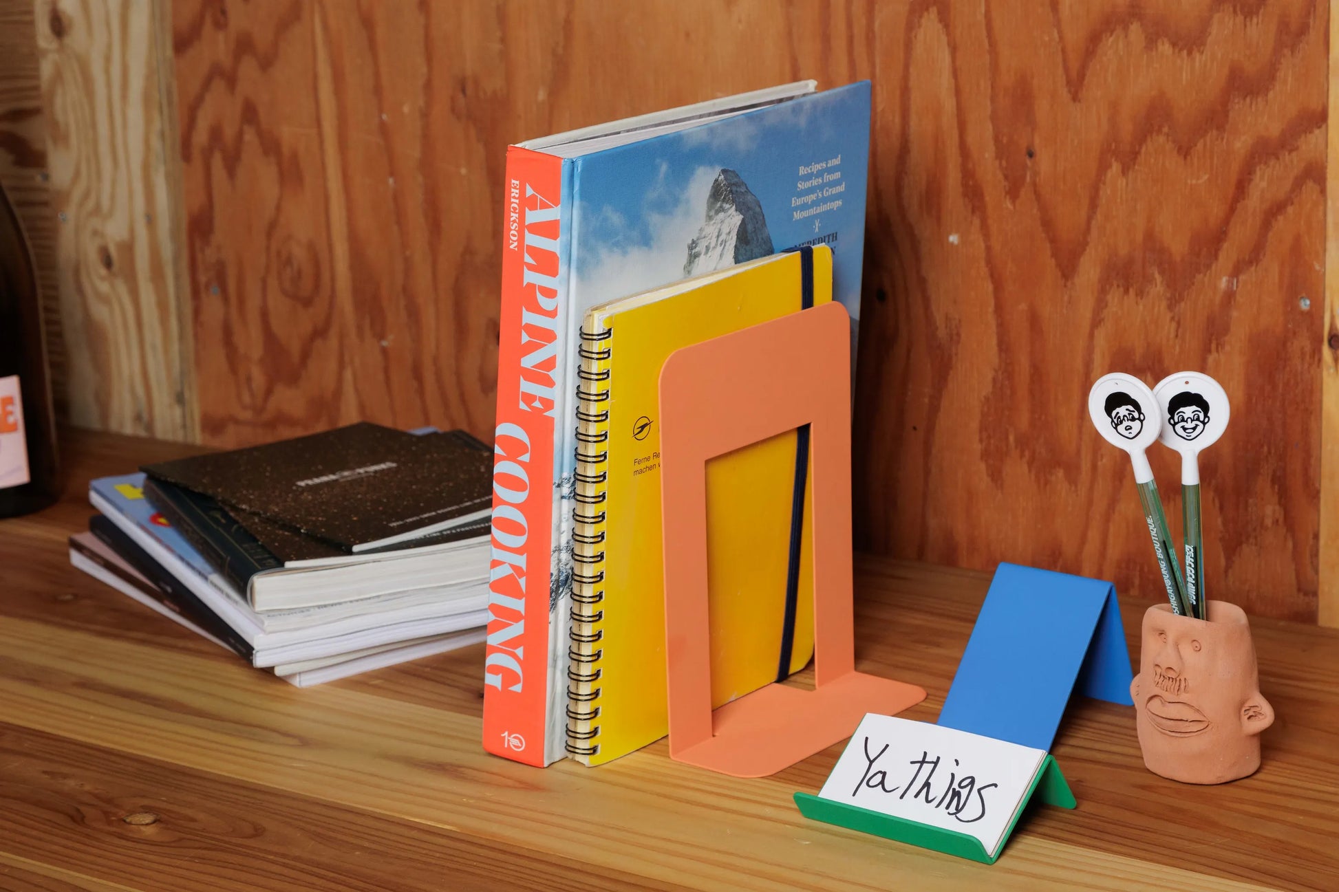 本、レコード、ぬいぐるみまで、何をたててもこれで挟めばサマになる。オレンジとブルーのグッとくるカラーで仕上げました。